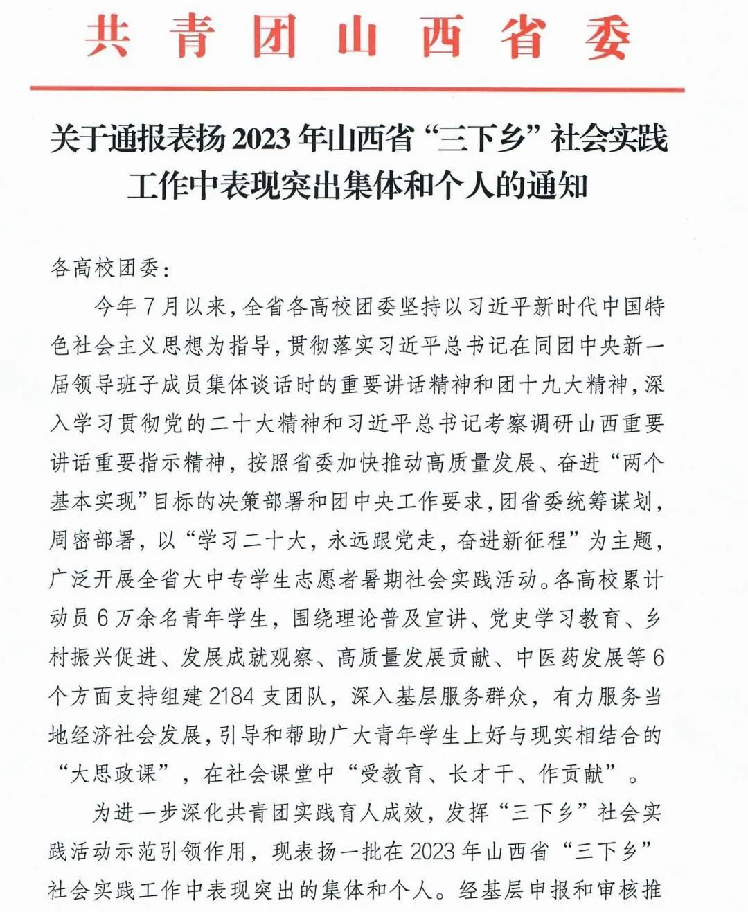 坚持以习近平新时代中国特色社会主义思想为指导,以“学习二十大,永远跟党走,奋进新征程”为主题,开展大学生志愿者暑期“三下乡”社会实践活动。近日,共青团山西省委发布《关于通报表扬2023年山西省“三下乡”社会实践工作中表现突出集体和个人的通知》,酒店偷拍