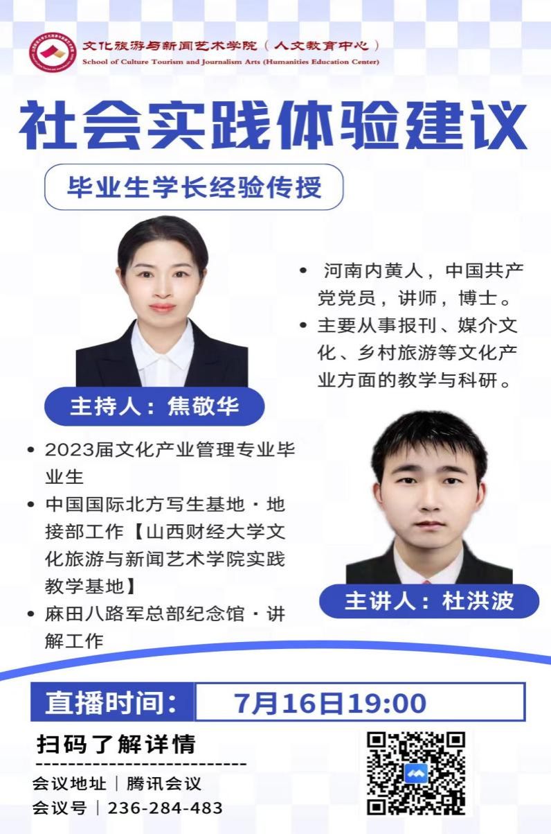 此次讲座由焦敬华老师主持,并邀请到了2023届文化产业管理专业毕业生杜洪波学长为大家答疑解惑。杜洪波学长现在麻田八路军总部纪念馆从事讲解工作,他凭借已有的工作经验向大家分享了在纪念馆讲解需要具备的职业素养和所学所感,并对社会实践体验提出了宝贵的建议。