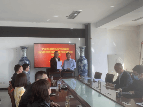 与山西平燕文化科技公司、山西智胜传媒科技股份有限公司在学院会议室举行战略合作签约仪式。学院院长弓志刚分别与山西平燕文化科技有限公司总经理贾占军、山西智胜传媒科技股份有限公司董事长郭海明签署战略合作协议。学院党委书记王振峰、科研副院长马慧强、教学副院长金春平、办公室副主任梁紫燕、团委书记孙敏以及合作企业团队成员参加。